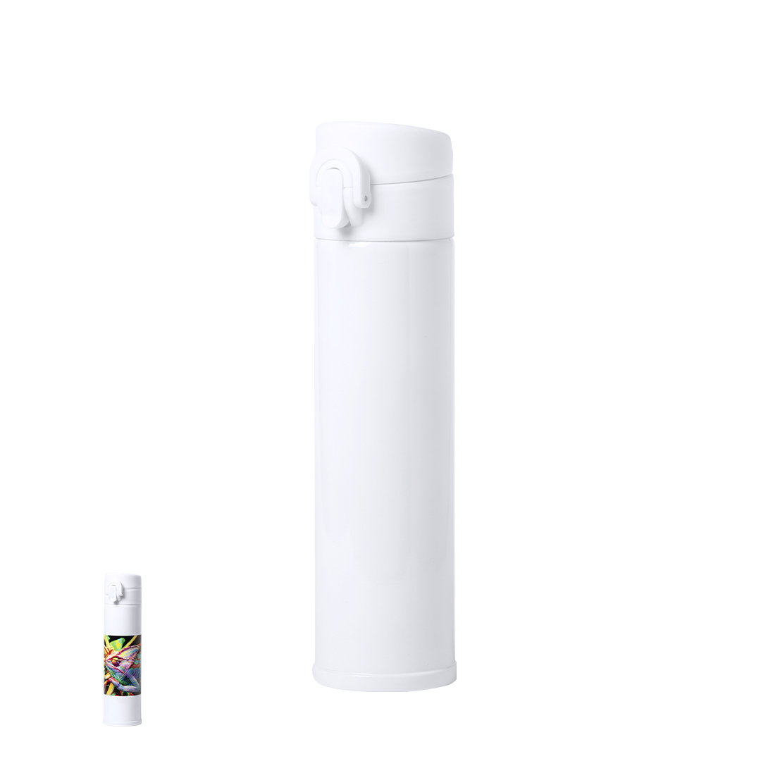 Termo en acero inox de 330ml de capacidad. Con doble cobertura para mejor y mas duradera conservación de la temperatura, con cierre de seguridad y sistema de apertura fácil con botón. Especialmente fabricado para impresión en sublimación y presentado en atractiva caja de diseño, Disponible manual de instrucciones en español e inglés.