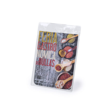 Identificador troquelado en PVC con cabecera en variados colores, ventana frontal transparente y parte trasera transparente.