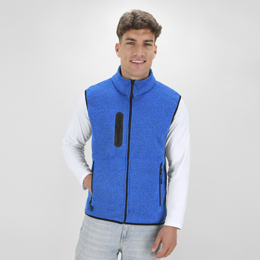 Chaleco de elegante diseño bitono en cálido y suave polar fleece de 280g/m2, con tratamiento anti-pilling, disponible en distintos colores. Cremallera central, bolsillos laterales y práctico bolsillo en el pecho, con cierres reforzados y tiradores en color negro. Con costuras laterales de aspecto moderno que aseguran un ajuste perfecto. Disponible en tallas XS, S, M, L, XL, XXL.