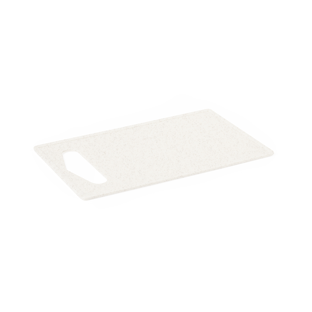 Tabla de cocina para cortar fabricada en PP. Con asa para un firme agarre, fácil de limpiar y guardar. Presentada individualmente bolsa reciclada.