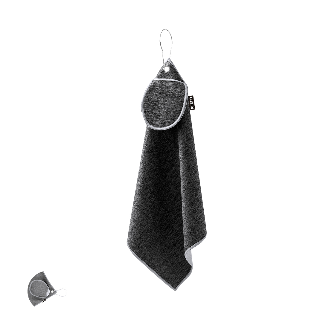 Toalla de golf fabricada en RPET con doble textura: suave acabado bitono por una cara y textura de hilo uniforme por la otra, para adaptarse a diferentes necesidades de limpieza. Su diseño incluye bolsillo para pelotas de golf a juego. Con argolla reforzada y mosquetón de acople. Incluye distintivo RPET en etiqueta.El material RPET se elabora a partir de plástico reciclado, para así fomentar la reutilización de residuos plásticos y ayudar a la sostenibilidad del planeta.