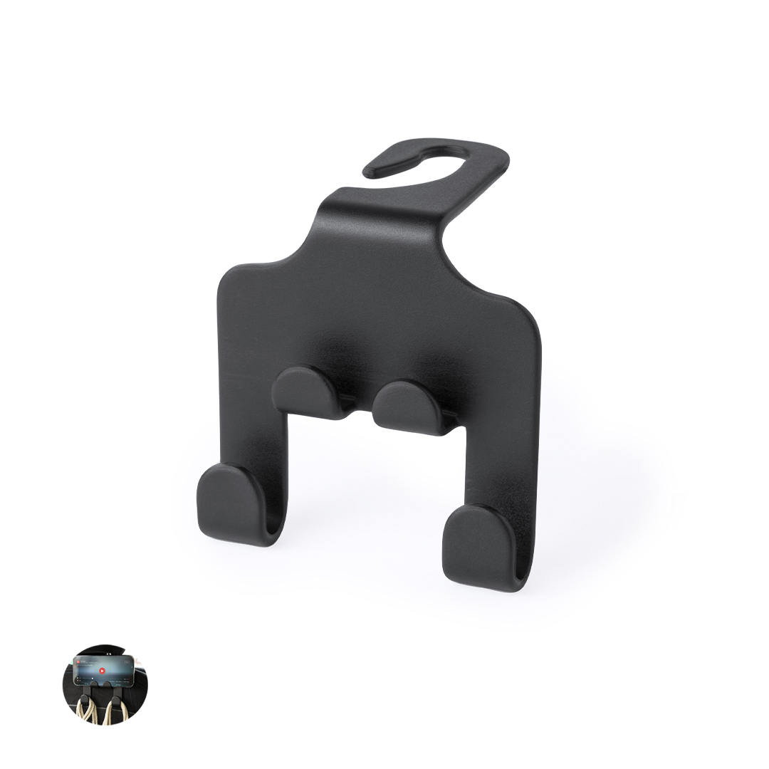 Resistente soporte fabricado en ABS. Fácil instalación mediante el gancho abierto diseñado para colocarse en el reposacabezas, con soporte para dispositivos móviles y dos ganchos adicionales para bolsas. Presentado en bolsa individual.