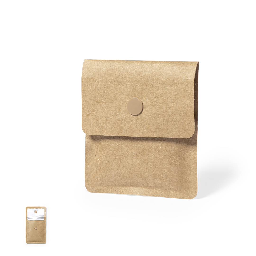 Cenicero de bolsillo de línea nature, con exterior en papel reciclado laminado e interior en aluminio ignífugo. Solapa con cierre de corchete a juego.