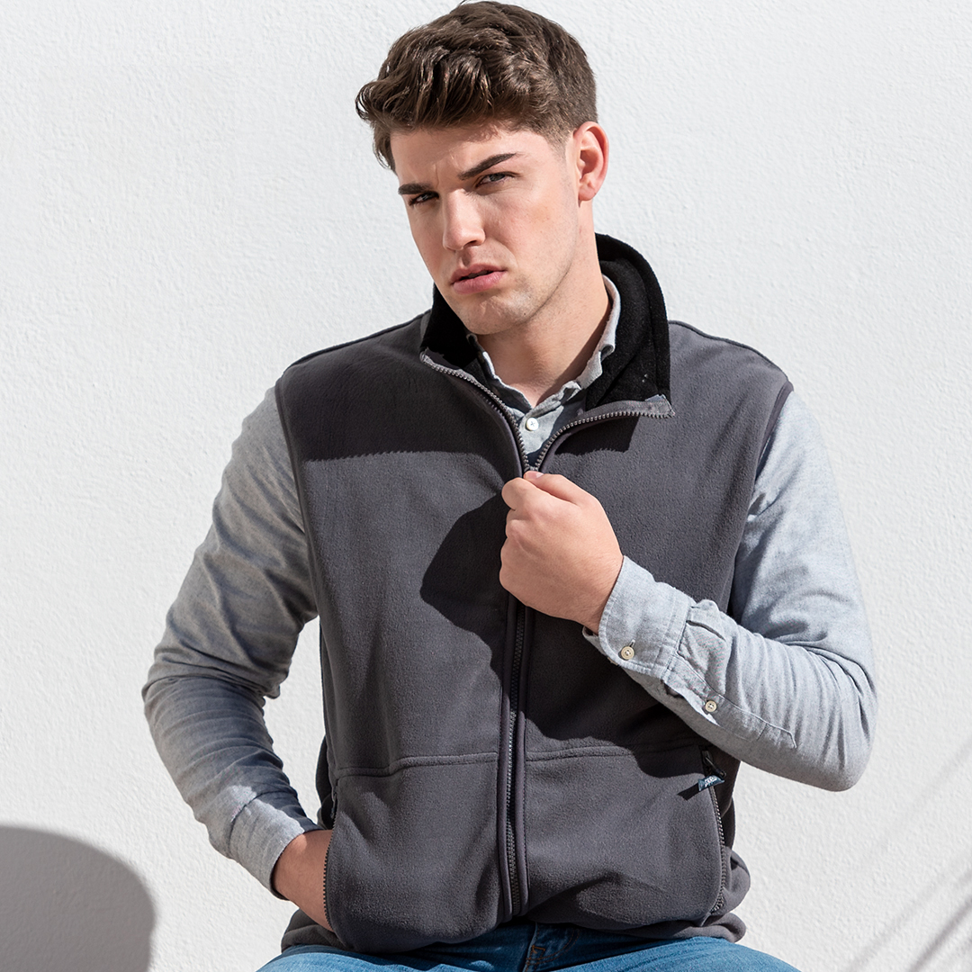 Chaleco en cálido y suave polar fleece de 280g/m2 con tratamiento anti-pilling. Con cuello de interior en color, cierre de cremallera con cinta en tirador, bolsillos laterales de cremallera y cintura elástica. Disponible en tallas M, L, XL, XXL.