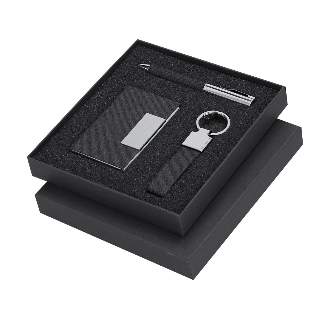 Elegante set en RPET con acabado negro bitono y detalles metálicos. Incluye:-Tarjetero de RPET con exterior negro bitono combinado y detalle metálico, 1 compartimento interior y sistema de cierre magnético.-Bolígrafo de RPET de acabado negro bitono y detalles metálicos. Con mecanismo giratorio y tinta azul.-Llavero en RPET de acabado color negro bitono y accesorios cromados.Presentado en estuche individual negro. Incluye tarjeta negra interior con distintivo RPET.El material RPET se elabora a partir de plástico reciclado, para así fomentar la reutilización de residuos plásticos y ayudar a la sostenibilidad del planeta.