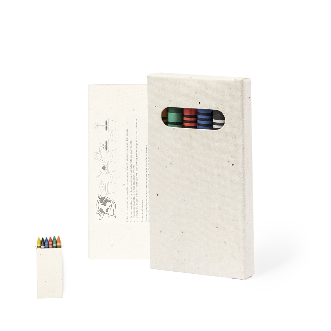 Set de 6 ceras en variada gama de colores, presentadas en caja de cartón natural con semillas. Incluye semillas de petunia en la caja, convirtiéndolo así en cartón plantable al final de su vida útil. Flores en colores surtidos, con instrucciones de plantado en la cubierta trasera.