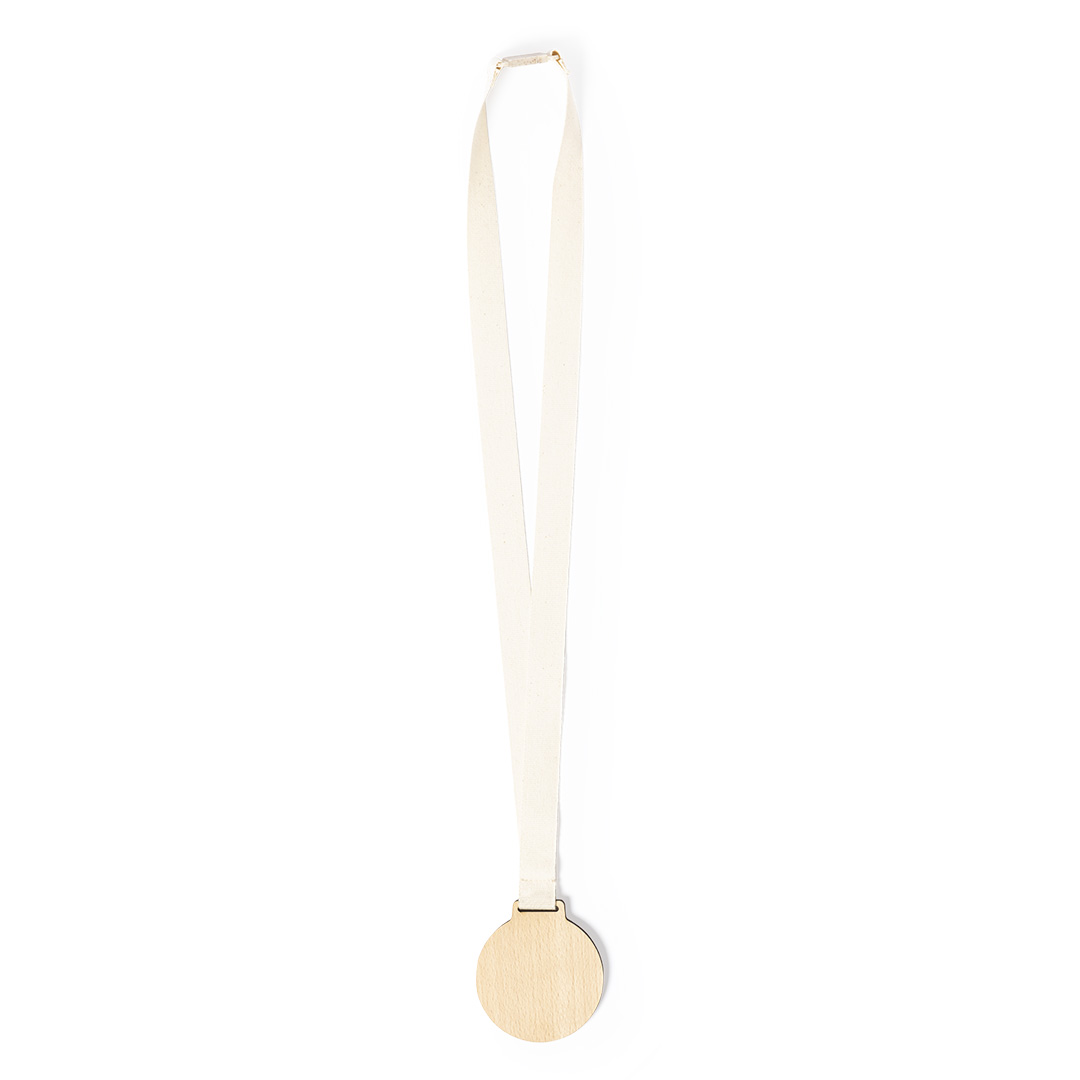 Medalla de línea nature fabricada en madera natural. Cordón fabricado en 100% algodón, con cierre de seguridad de fibra de trigo en el cuello.