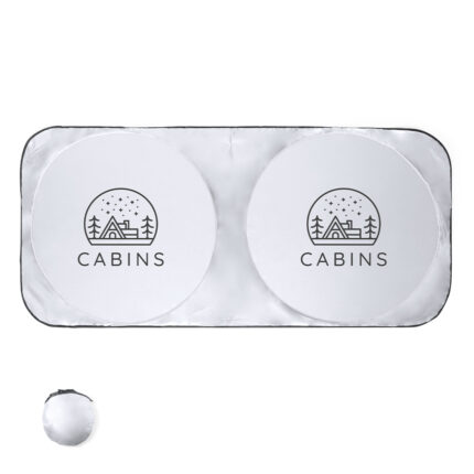 Parasol en aluminio a una cara en color plateado de acabado metalizado con ribetes de poliéster en color negro. De tamaño 130x70cm y espuma en el reverso. Cintas elásticas de plegado con argollas metálicas de refuerzo, dos ventosas para ajuste en luna y presentación desplegado en plancha para fácil impresión.