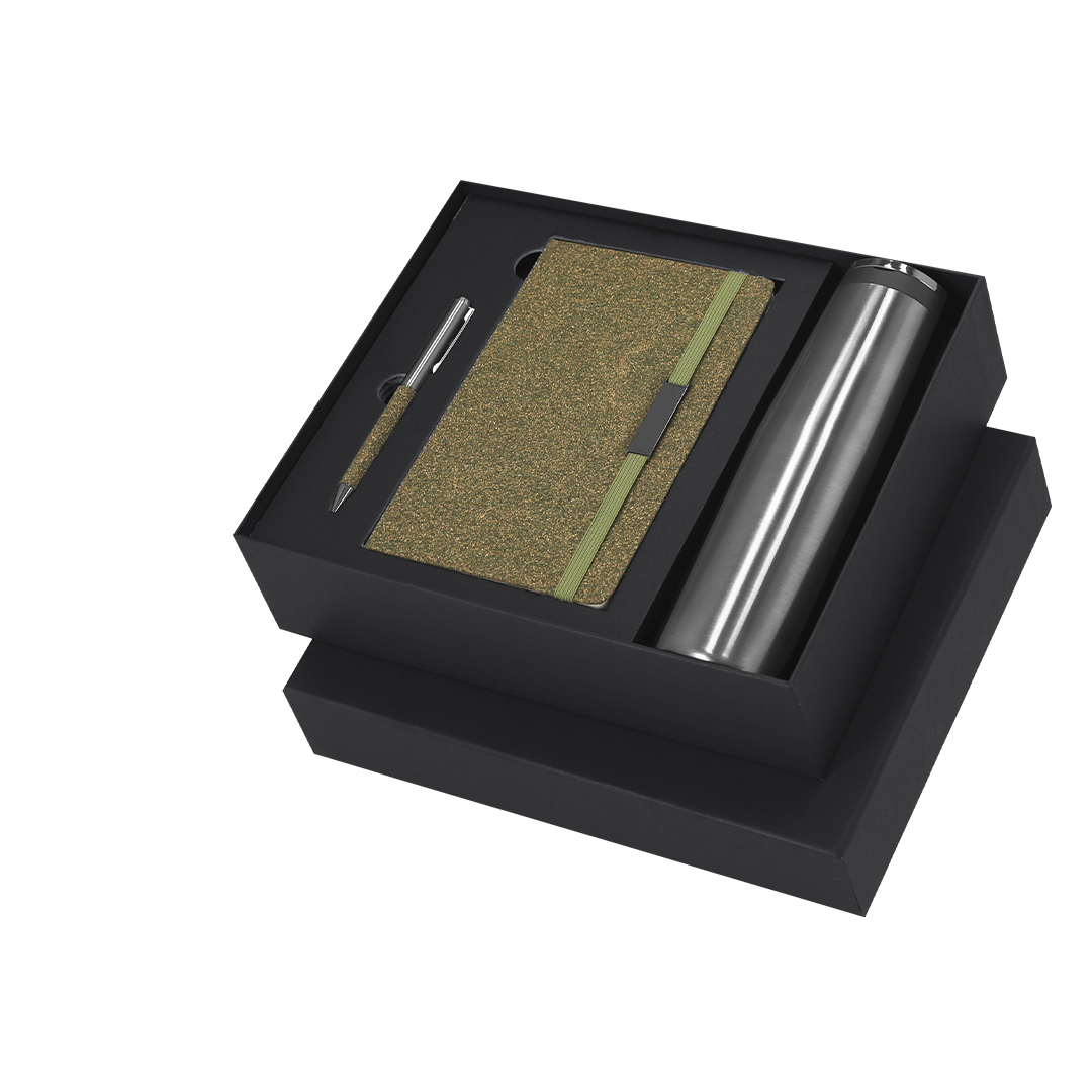 Set de bloc de notas y bolígrafo confeccionados con Fibra de Té, además de un bidón térmico fabricado en acero inox.El set incluye:- Bloc de notas de tapas rígidas, con 80 páginas rayas, banda elástica con clip metálico y marcapáginas a juego. – Bolígrafo de aluminio en acabado cromado con empuñadura de Fibra de Té, mecanismo giratorio y tinta azul. – Bidón térmico de doble pared fabricado en acero inox de 500ml. Con tapón a rosca y asa metálica. Bloc con logo Tea Grounds marcado en la parte posterior. Presentado de manera elegante en una caja negra con interior troquelado. Tea Grounds es un material sostenible creado a partir de residuos de hojas de té recicladas. Durante el procesamiento del té, se recolectan y compactan los restos para darles una segunda vida como recurso útil. Su producción fomenta la economía circular y reduce el impacto ambiental.