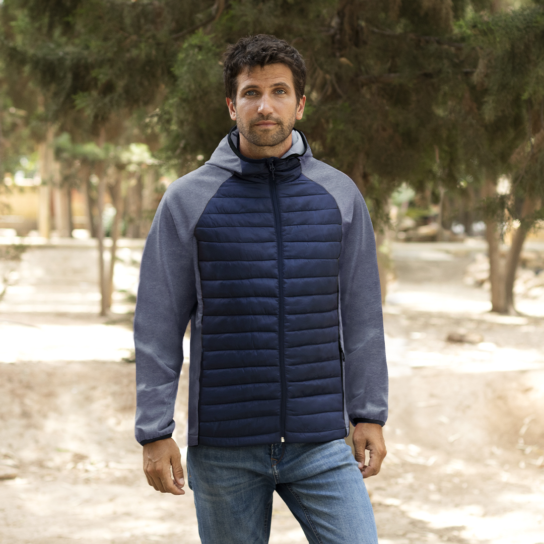 Chaqueta unisex transpirable en combinación de materiales soft shell y poliéster, con tejido acolchado tacto pluma en frontal y espalda. Capucha y manga estilo ranglán con ribete elástico en cuello, puños y bajo . De elegante construcción en combinación de colores negro y gris, resistente al viento y al agua. Cierre de cremallera y bolsillos laterales de cremallera con tiradores para fácil apertura. Disponible en tallas S, M, L, XL, XXL.