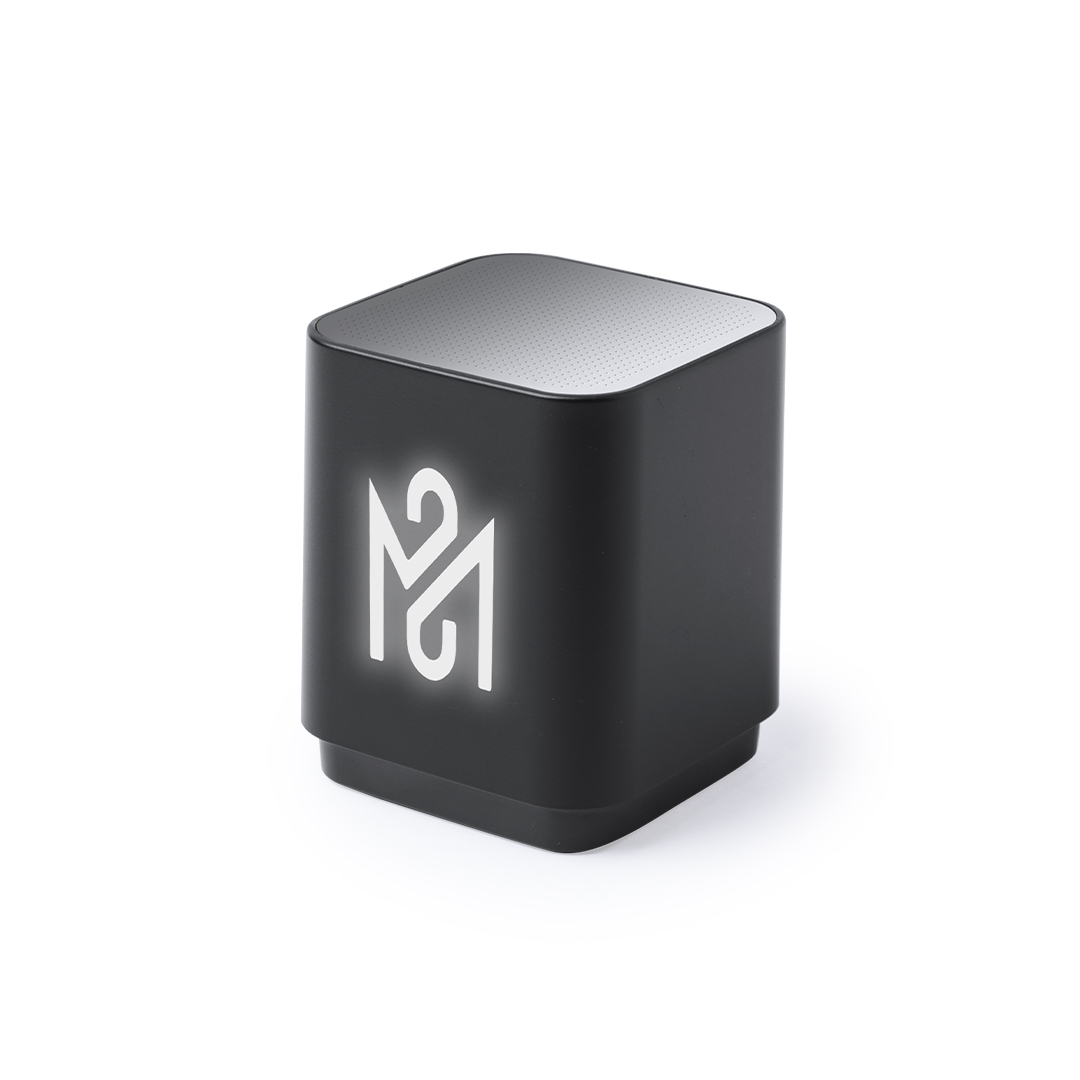 Altavoz con conexión Bluetooth, luz led interior y cuerpo especialmente diseñado para marcaje en láser, iluminando así el logotipo. Con 3W de potencia y función manos libres. Recargable mediante cable USB -incluido- y presentado en una atractiva caja de diseño.