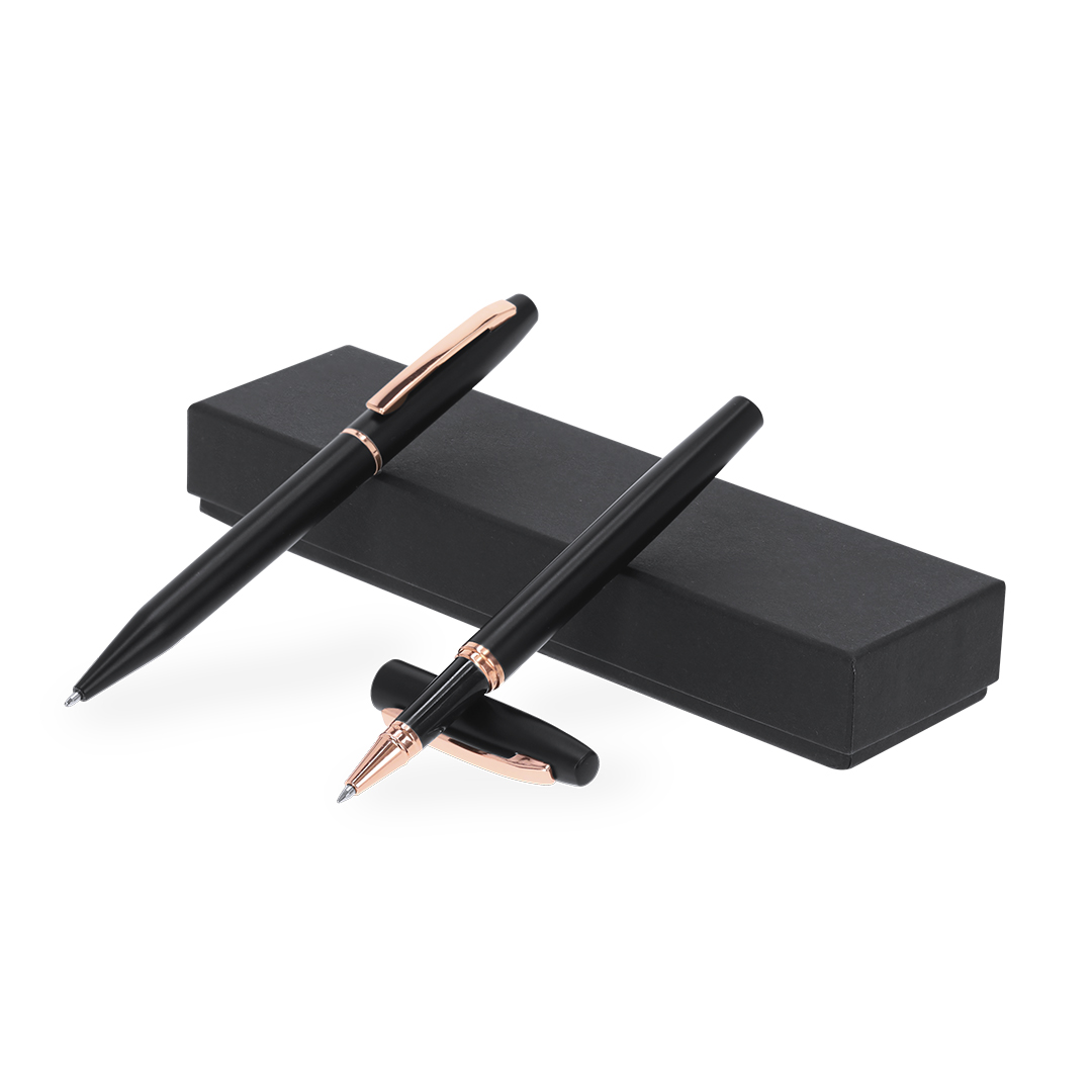 Set de bolígrafo y roller fabricados en Aluminio Reciclado, en elegante diseño negro mate con distinguidos accesorios en acabado oro rosa. Bolígrafo de mecanismo giratorio y roller con capucha, ambos con clip metálico. En tinta azul y logotipo de Aluminio Reciclado. Presentación en elegante estuche negro.El Aluminio Reciclado es un material con posibilidades de reciclaje casi infinitas, sin perder sus propiedades originales y consumiendo menos energía en este proceso.Certificación GRS (Global Recycled Standard / Estándar de Reciclaje Global), que garantiza el origen reciclado del material usado para fabricar el producto.