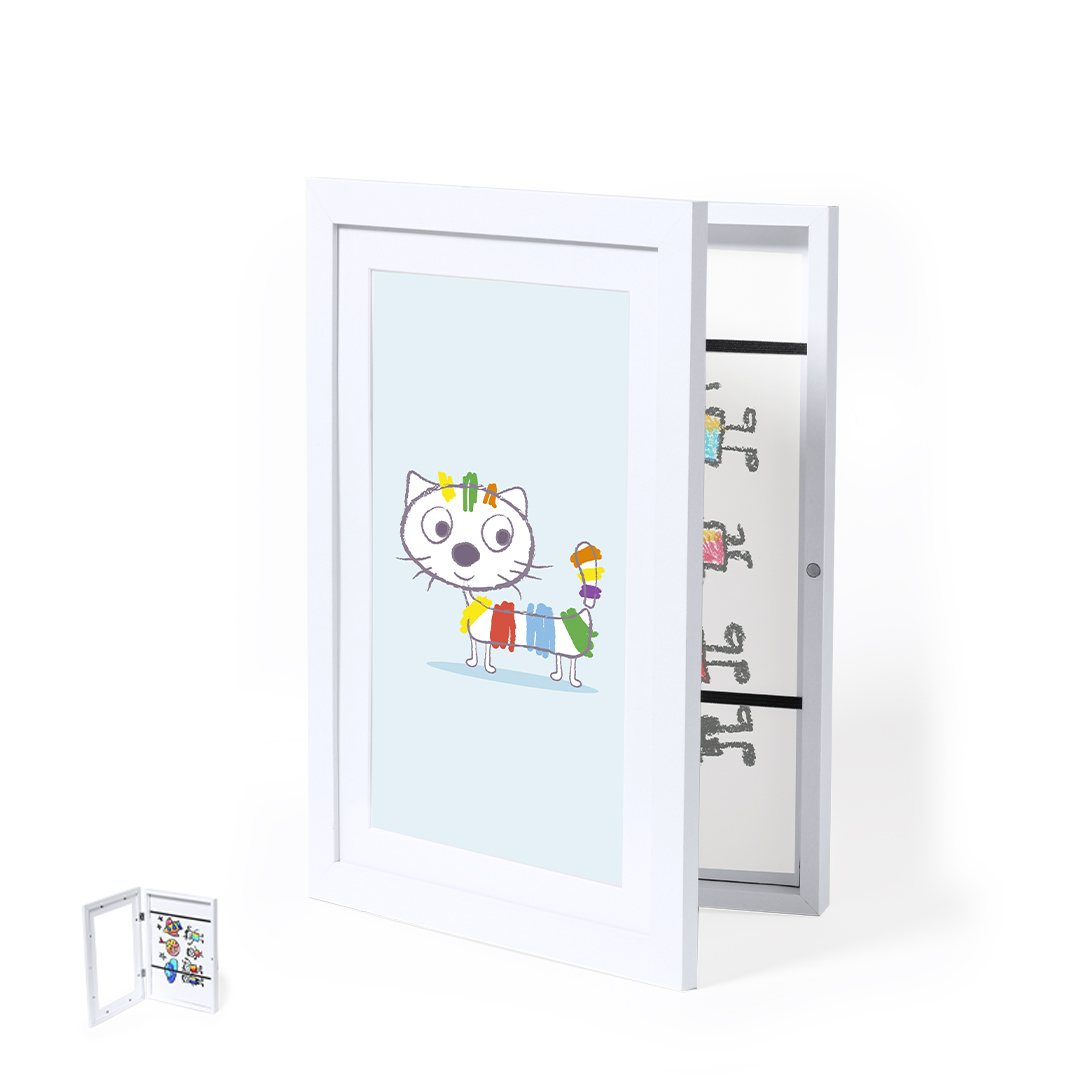 Elegante marco de arte que combina funcionalidad y estilo. Ofrece un compartimento para almacenar diseños de tamaño A4 sujetos por bandas elásticas, mientras que en su portada incorpora un marco para resaltar el diseño elegido. Se destaca por su apertura de bisagras y cierre magnético, garantizando un manejo práctico y seguro. Presentado de forma individual en caja de diseño kraft.