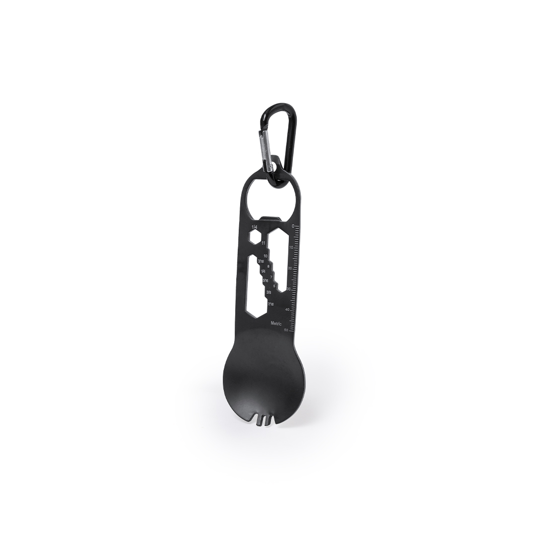Completa multiherramienta con 16 funciones en acero inox. Incluye: mosquetón para transportarlo fácilmente, zona plana función destornillador, abrebotellas, regla de hasta 5 cm en un lateral, parte central para tuercas de 11 medidas diferentes (desde 1/4 hasta 11) y práctica cuchara con dientes para uso de tenedor. Presentada en una bolsa individual.