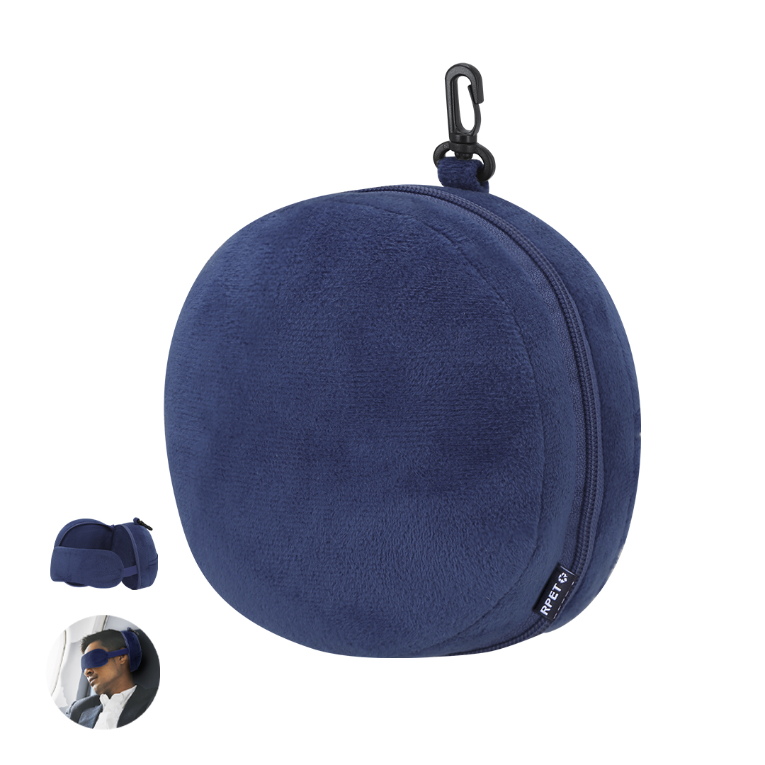 Almohadilla con Antifaz ideal para viajes fabricada en suave material RPET.Incluye antifaz interior adaptable mediante dos gomas elásticas a juego para mayor comodidad y descanso durante el viaje. Cuenta con un esponjoso reposacabezas plegable con cierre de cremallera, lo que facilita su almacenamiento. Además, dispone de práctico bolsillo exterior y mosquetón de plástico en color negro, que permite transportarlo de cómoda.Este accesorio combina funcionalidad, diseño compacto y siendo perfecto sus viajes.El material RPET se elabora a partir de plástico reciclado, para así fomentar la reutilización de residuos plásticos y ayudar a la sostenibilidad del planeta.