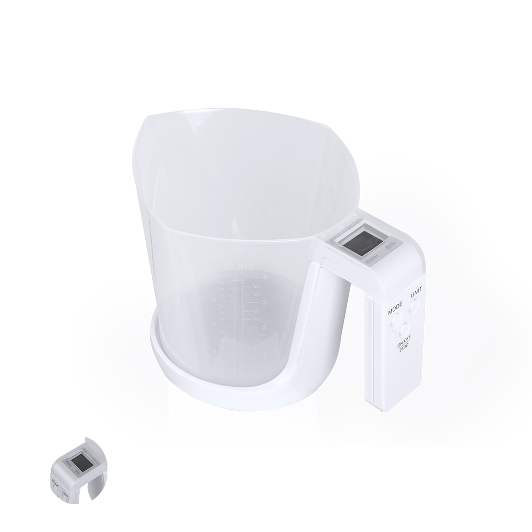 Báscula con jarra medidora integrada, fabricada en resistente combinación de PP y ABS. Pantalla LCD con control por botones y función de tara, con capacidad máxima para 5 kg de peso y válida para medir elementos líquidos o sólidos.Incluye Jarra medidora de 1L de capacidad, con multitud de opciones y vertedor para evitar derrames:-1L, con medidor lateral en tramos de 50 ml.-32 oz, con medidor lateral en tramos de 2 oz. -Medición rápida en volumen de tazas.Funciona con pila de botón (incluida) y viene presentada individualmente en caja.