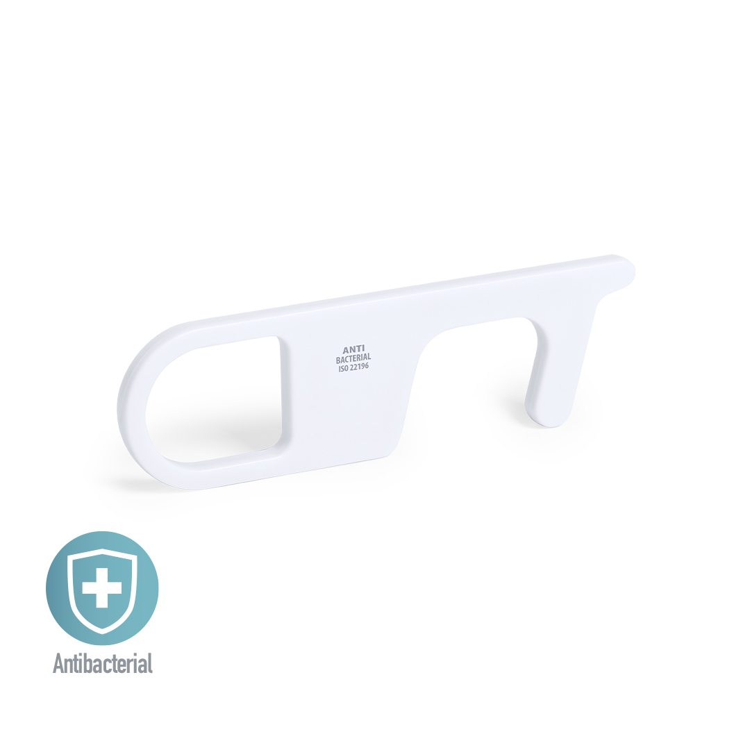 Llavero higiénico antibacteriano y anti-contacto, fabricado en resistente ABS de acabado sólido. Especialmente diseñado para evitar tocar con las manos superficies de uso común (picaportes de puertas, interruptores, grifos de uso público, cajeros automáticos…). Con cómodo troquel para el dedo y presentado en bolsita individual. Recomendado para marcaje en tampografía.Los productos con tratamientos antibacterianos son capaces de reducir drásticamente las cargas bacterianas presentes en las superficies de los materiales, gracias a la incorporación de agentes microbianos permanentes estáticos, con alta efectividad para inhibir y prevenir la contaminación bacteriana.Artículo de acuerdo al estándar ISO 22196, que determina la actividad antibacteriana en materiales plásticos y superficies no porosas, lo que permite conocer la efectividad de inhibición microbiana que tienen los aditivos sobre los objetos tratados mediante una evaluación cuantitativa.