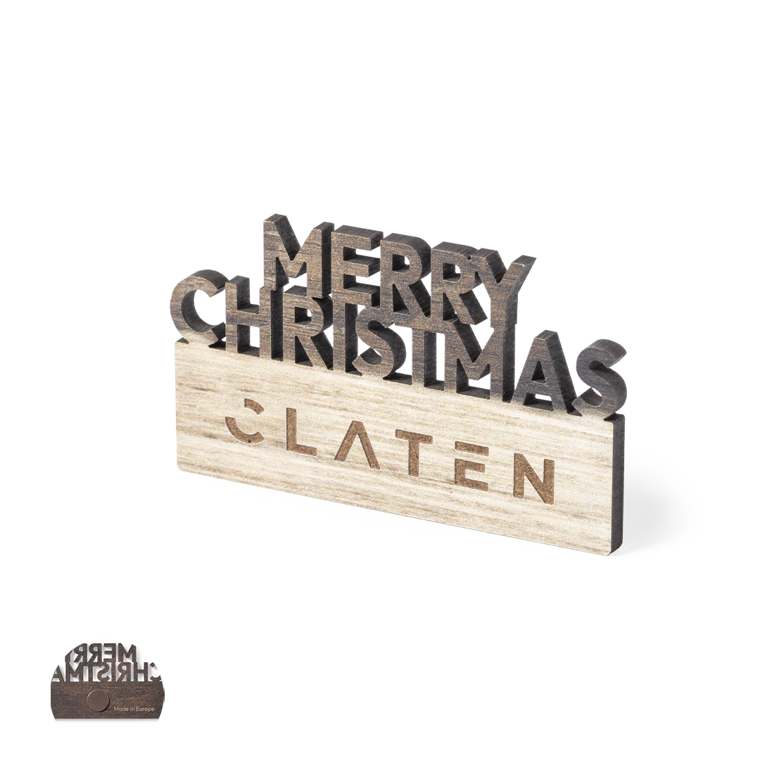 Original imán Merry Christmas fabricado en madera natural, con texto troquelado y de original acabado bicolor. Amplia superficie de marcaje y distintivo Made In Europe.