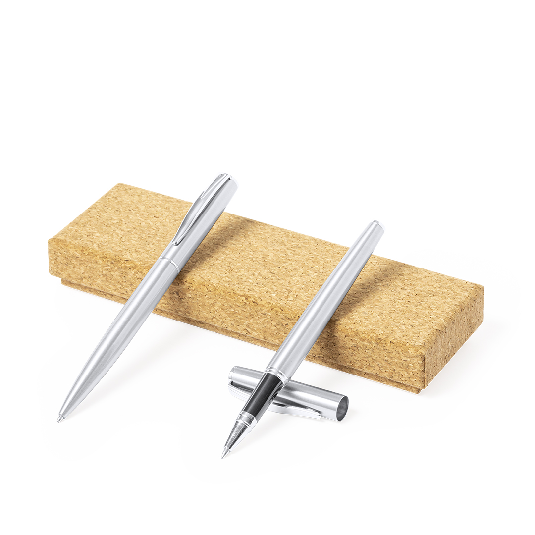 Set de bolígrafo y roller fabricados en Acero Inox Reciclado. Bolígrafo de mecanismo giratorio y roller con capucha, ambos con clip metálico y en tinta azul, con cuerpo de acabado brillante y logotipo Acero Inox Reciclado incluido. Presentados en un estuche de corcho.El acero es uno de los materiales más demandados y que puede encontrarse casi en todas partes, desde productos de uso diario a grandes construcciones. Con innumerables propiedades, entre las que cabe destacar la durabilidad y su alto grado de reutilización, convirtiéndolo en una alternativa muy valorada en soluciones de sostenibilidad. Debidamente tratado, permite obtener nuevos recursos de infinita utilización.