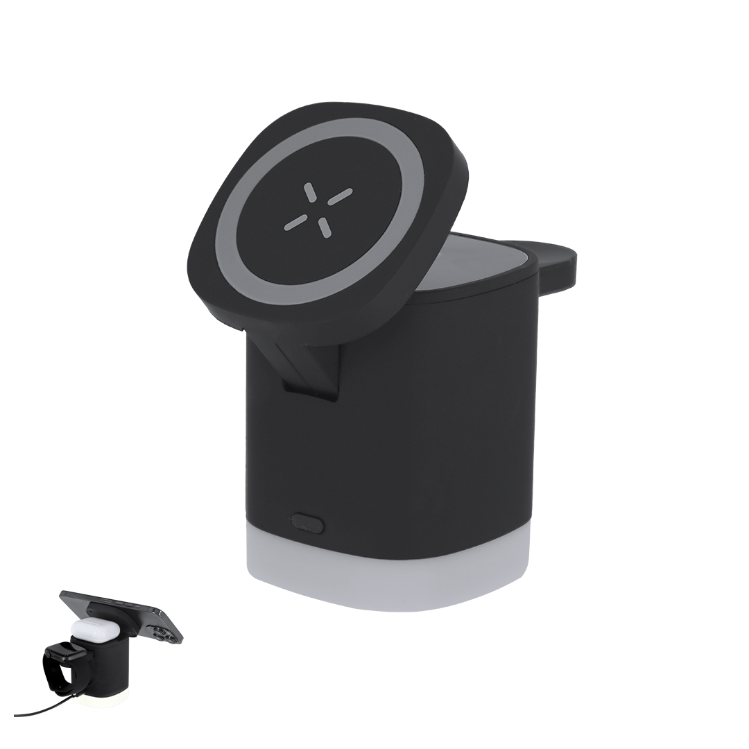 Cargador inalámbrico magnético 3 en 1 de 15W, fabricado en ABS reciclado (RABS). Diseñado para la carga simultánea del smartphone, auriculares y smartwatch. Cuenta con lámpara integrada en la base con 2 modos de luz ajustables en blanco.Clave tipo C incluido. Un gadget todo en uno: plegable, portátil, versátil y de diseño funcional.El RABS es un plástico altamente reciclable de gran resistencia y con multitud de aplicaciones que lo convierten en una solución eco-friendly. Fabricado conforme a los estándares RoHS y en cumplimiento con los siguientes requisitos de seguridad:Sistema de protección contra sobrecalentamiento.Sistema de protección contra sobrecarga.Sistema de bloqueo para evitar cortocircuitos.