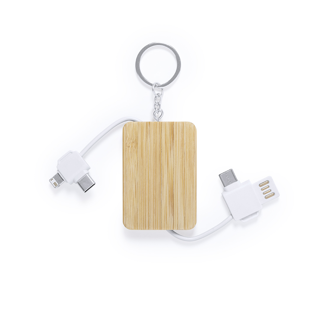 Cargador llavero de línea nature y diseño compacto. Hecho en bambú procedente de cortes naturales. Conexiones Tipo C (entrada y salida) y dual micro USB-Lightning, con sistema USB reversible que facilita la conexión a la fuente de alimentación. Amplia superficie de marcaje. Presentado en bolsa individual autocierre de diseño eco.