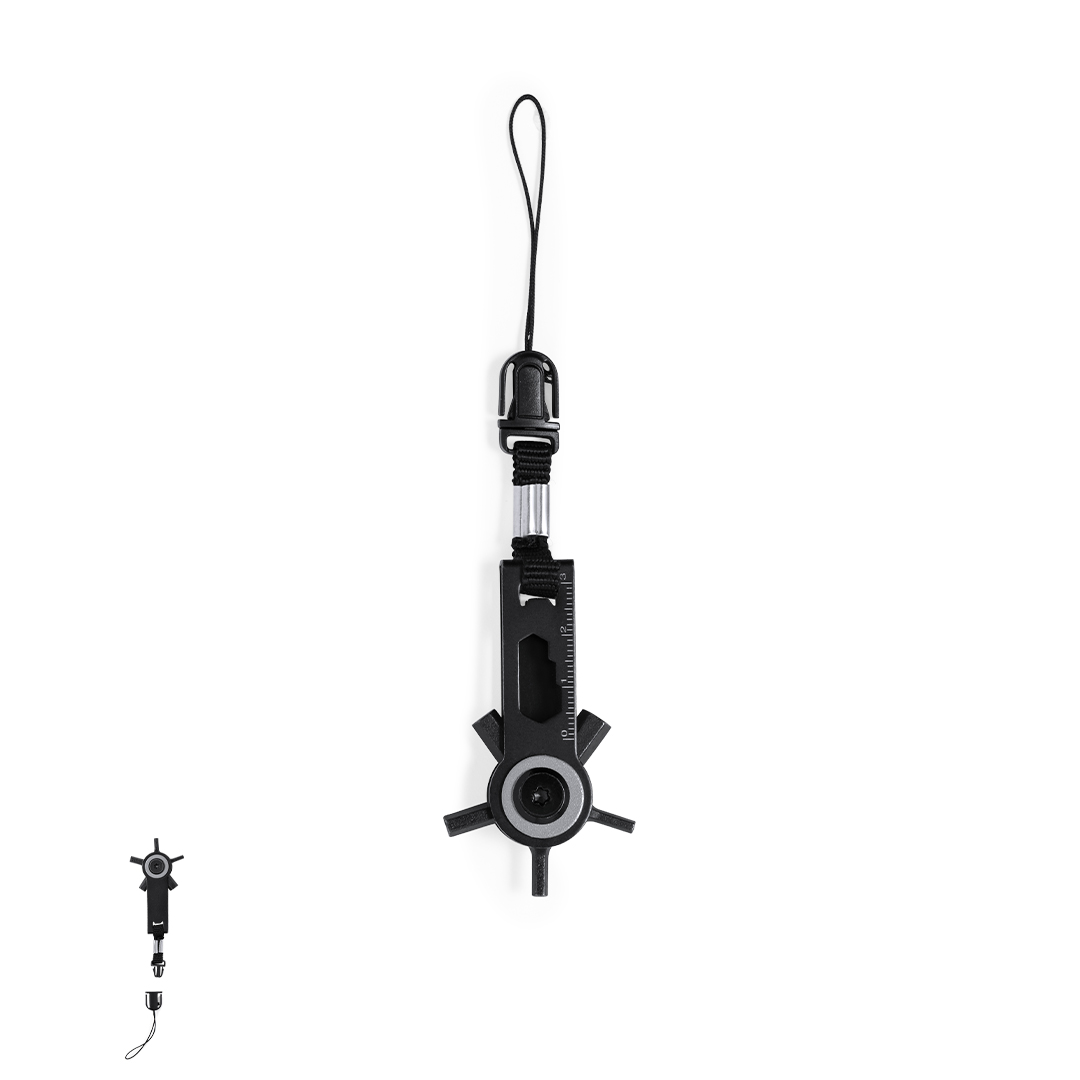 Eficaz multiherramienta con cabezal giratorio fabricada en acero inox y acabado en negro. Con 10 funciones: llaves allen, llave para tuercas hexagonales en varios tamaños, regla y un práctico accesorio de transporte con cierre de hebilla. Presentado en bolsa de papel reciclada de diseño kraft.