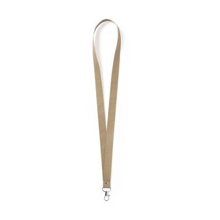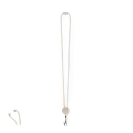 Lanyard de línea nature en material 100% algodón. Hebilla y cierre de seguridad en cuello de caña de trigo/PP, para así fomentar la utilización de materias primas naturales y reducir las emisiones contaminantes. Con mosquetón metálico giratorio y disponible en color natural.