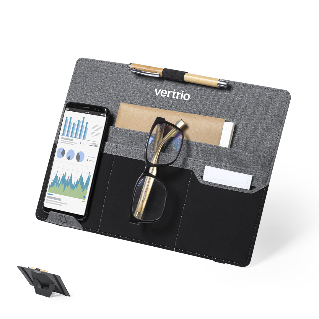 Elegante y práctico organizador con soporte imantado, ideal para facilitar el trabajo o uso de portátil en cualquier lugar o espacio. Fabricado en resistente poliéster gris jaspeado con detalles en polipiel de color negro. Incluye soporte para bolígrafo y smartphone, con 4 bolsillos elásticos para el almacenamiento de diferentes gadgets.