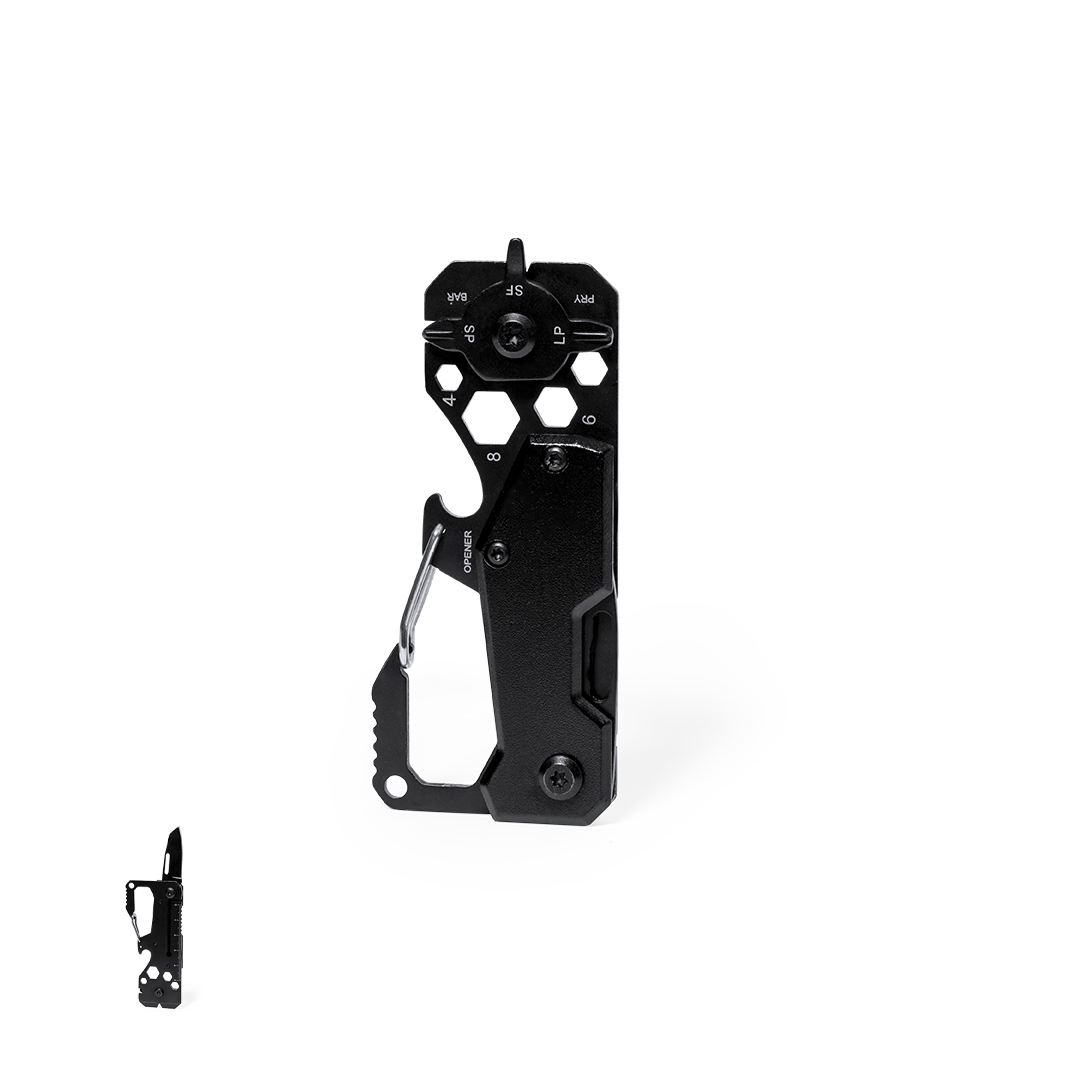 Excelente multiherramienta fabricada en aluminio y acero inox con acabado en color negro. Incluye 13 funciones diferentes: llave para tuercas hexagonales en varios tamaños, mosquetón, abrelatas, regla, rasqueta, cuchillo, destornilladores planos y philips. Presentada en caja de diseño kraft.