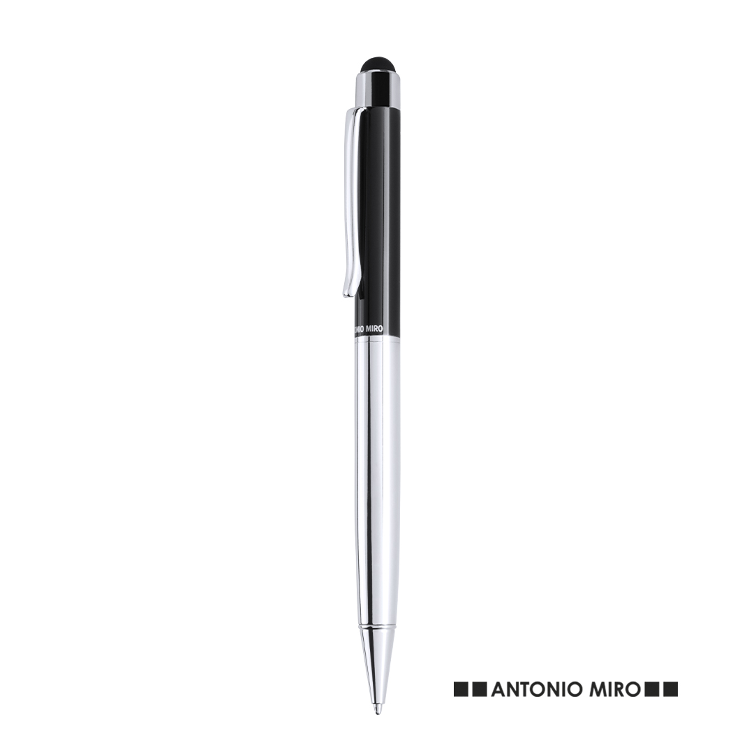 Bolígrafo puntero de Antonio Miró de mecanismo giratorio con suave cuerpo metálico, de elegante combinación de colores en plateado y negro. Clip y punta de diseño a juego. Presentado en estuche individual negro con logotipo de la marca. Tinta azul.