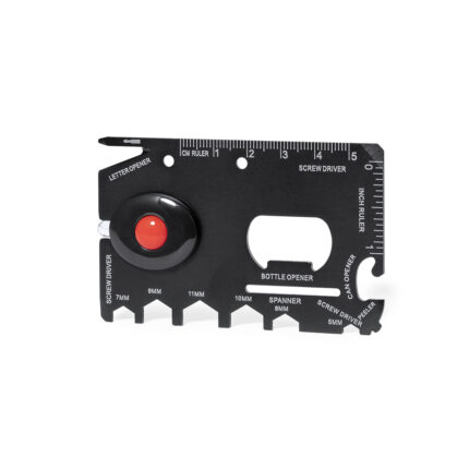 Original y práctica multiherramienta en acero inox con forma de camión. Con 18 funciones, entre otras: destornillador de punta plana y philips, llave para tuercas hexagonales en varios tamaños, regla, abridor de cajas y abrebotellas. Presentado en bolsa de papel reciclada.